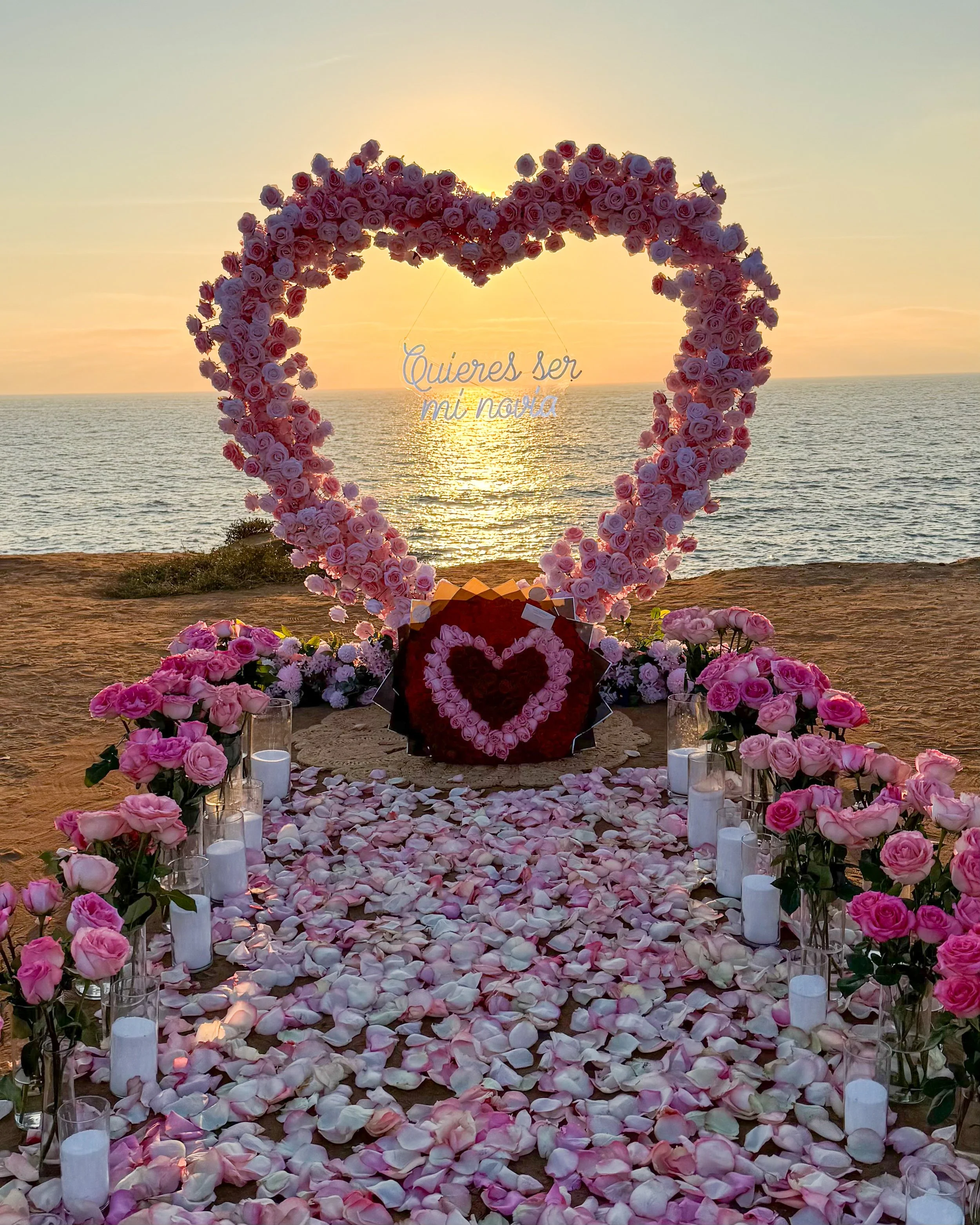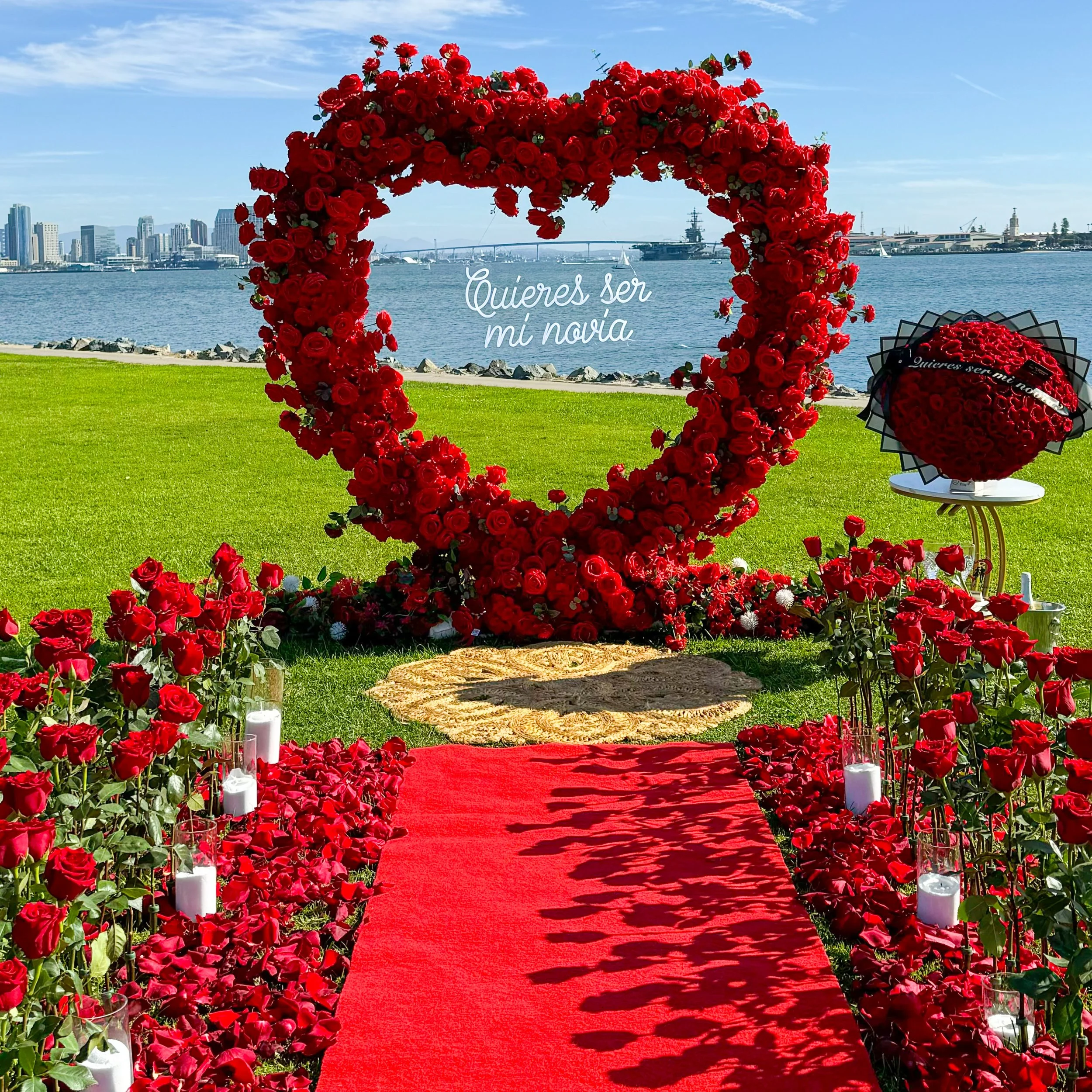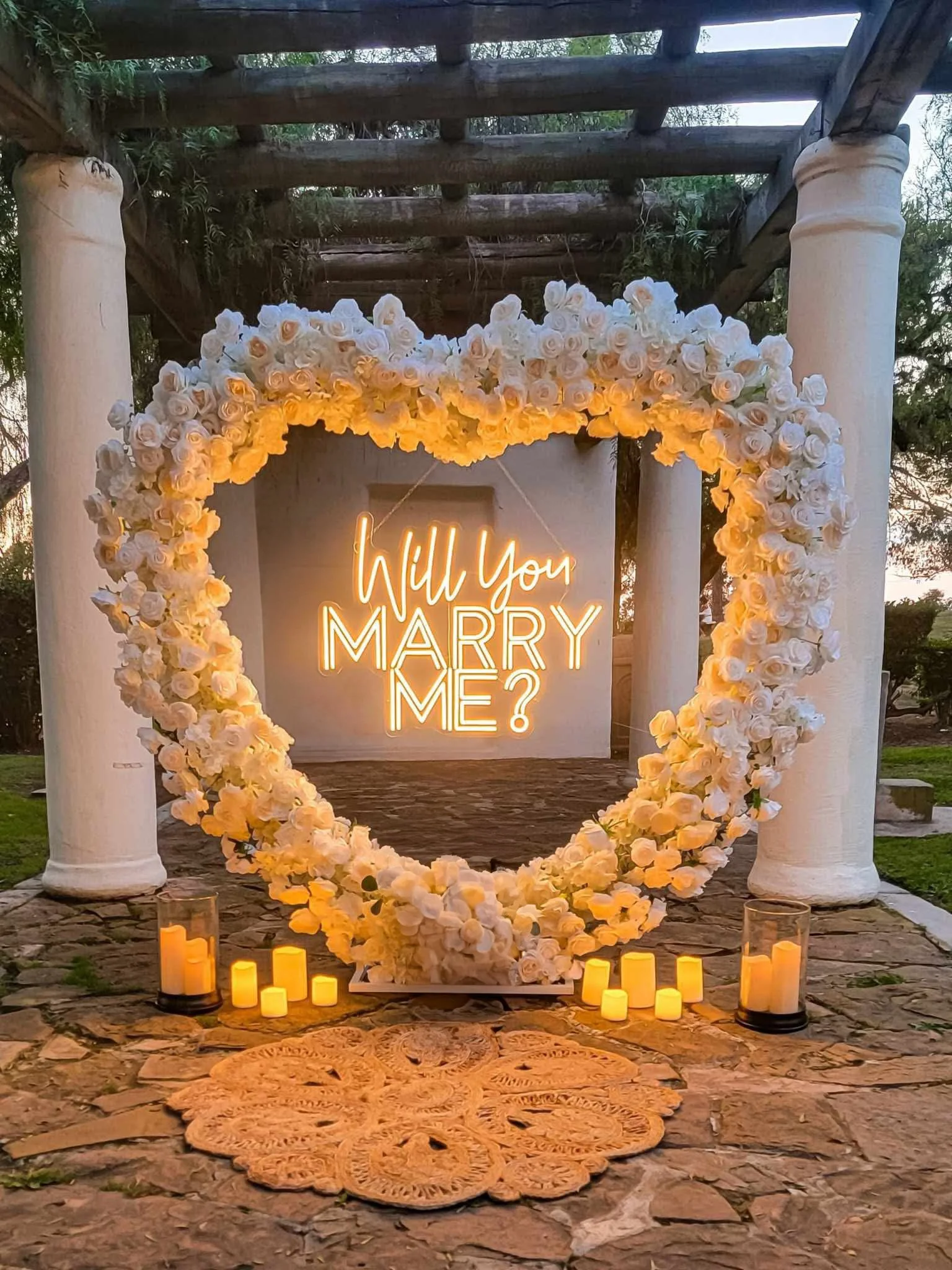 Heart arch with florals (available in white, pink and red), with any of our LED signs, (“Will you Marry me?’, “Quieres ser mi novia”, etc). Candles and rug. Bluetooth speaker (to play your song).