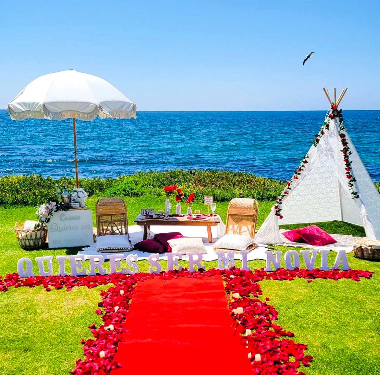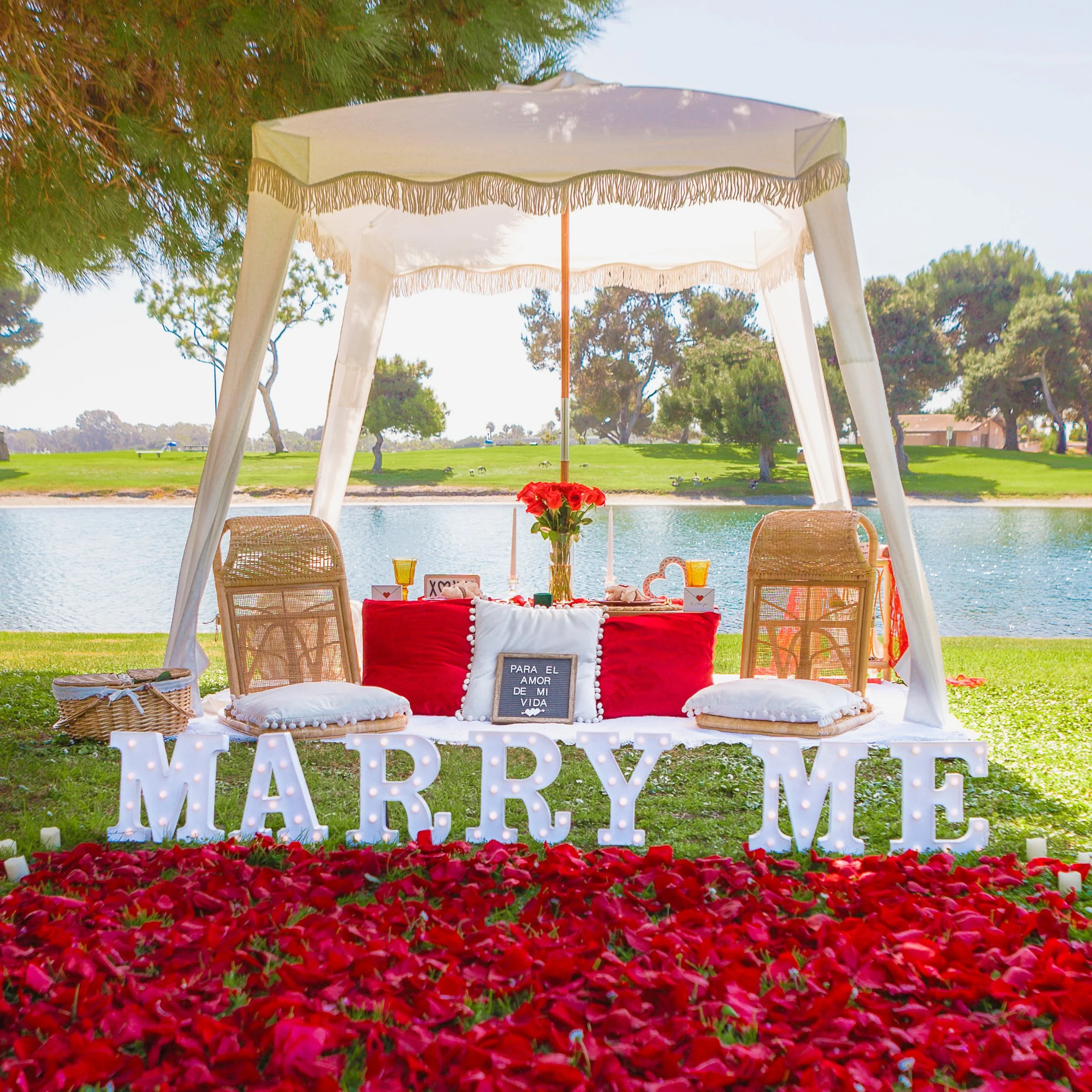 Propose to your sweetheart with our sweet proposal setup which includes full picnic table and decor (plates, glasses, napkins and silverware), an assortment of pillows , blankets, a personalized message sign, lace teepee and fringe umbrella, floor rattan chairs. Plus 9(in) letters that says “ Marry Me”, “I Love U”, “Quieres ser mi novia”, or “ Be My GF”, and scattered fresh petals.