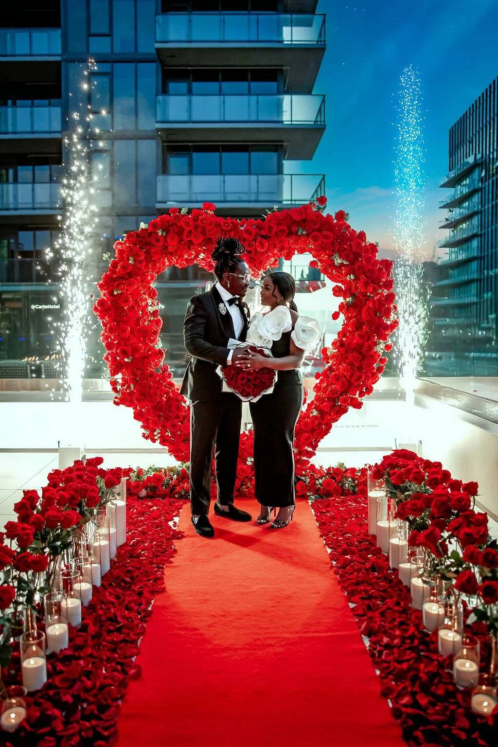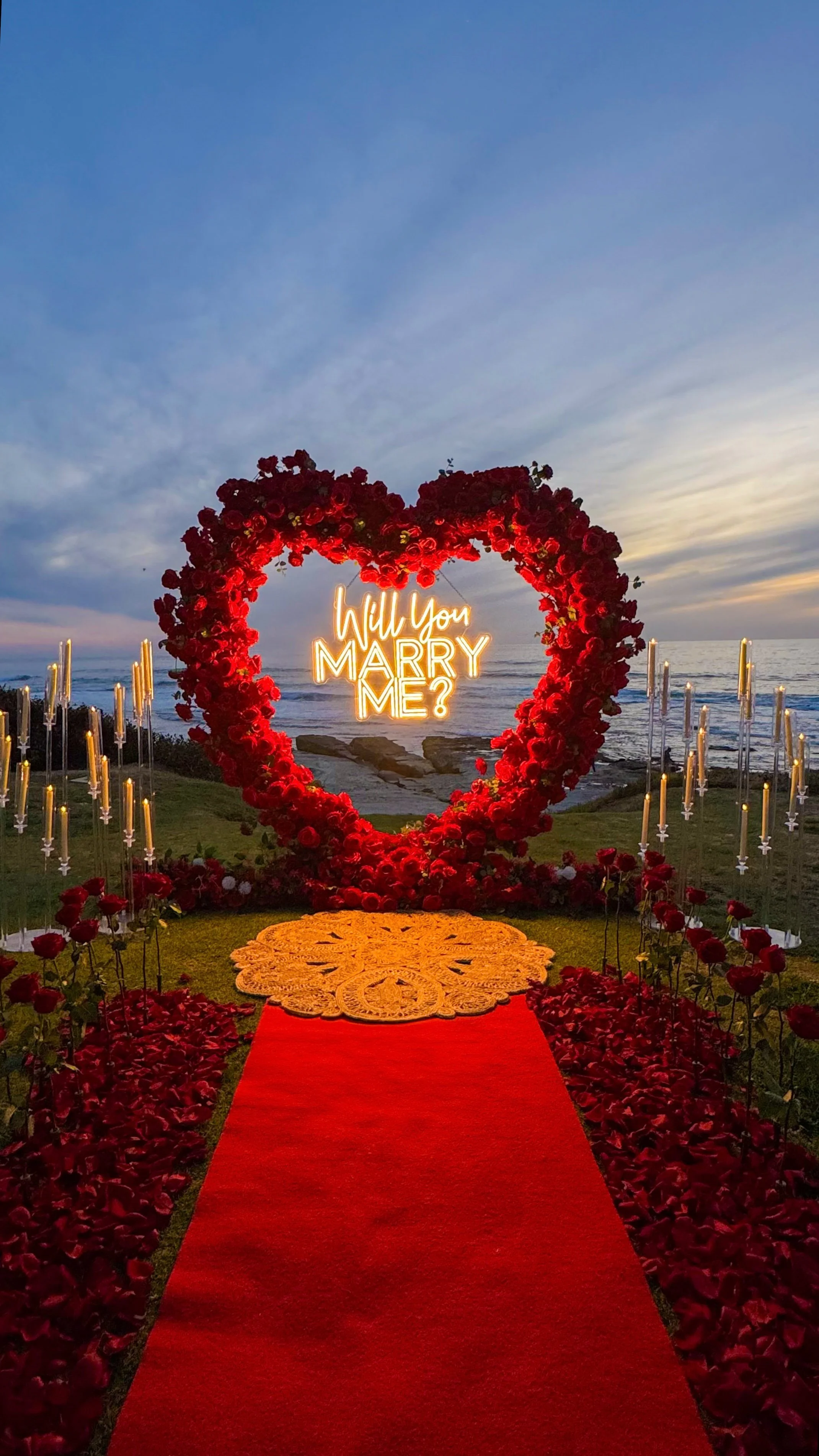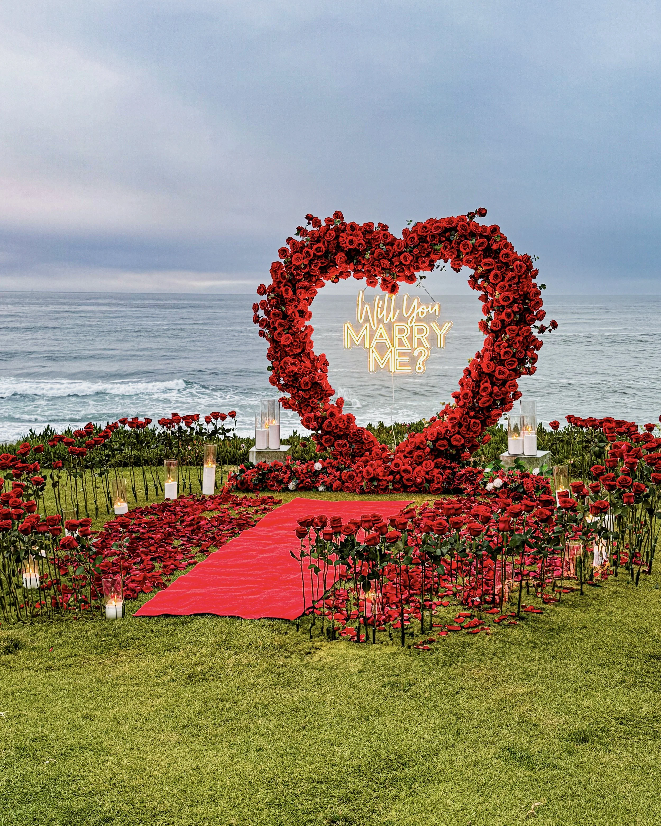 Deluxe Heart Arch includes your choice of Red, Pink or White Heart Arch with LED “Will you Marry Me?” Or ¨It was always you¨ Hanging sign, 200 STANDING FRESH ROSES, LUXURY SAND CANDLES (20ct), tons of fresh scattered petals, sparkling cider in ice bucket with glasses, red carpet, and Bluetooth speaker (to play your song).