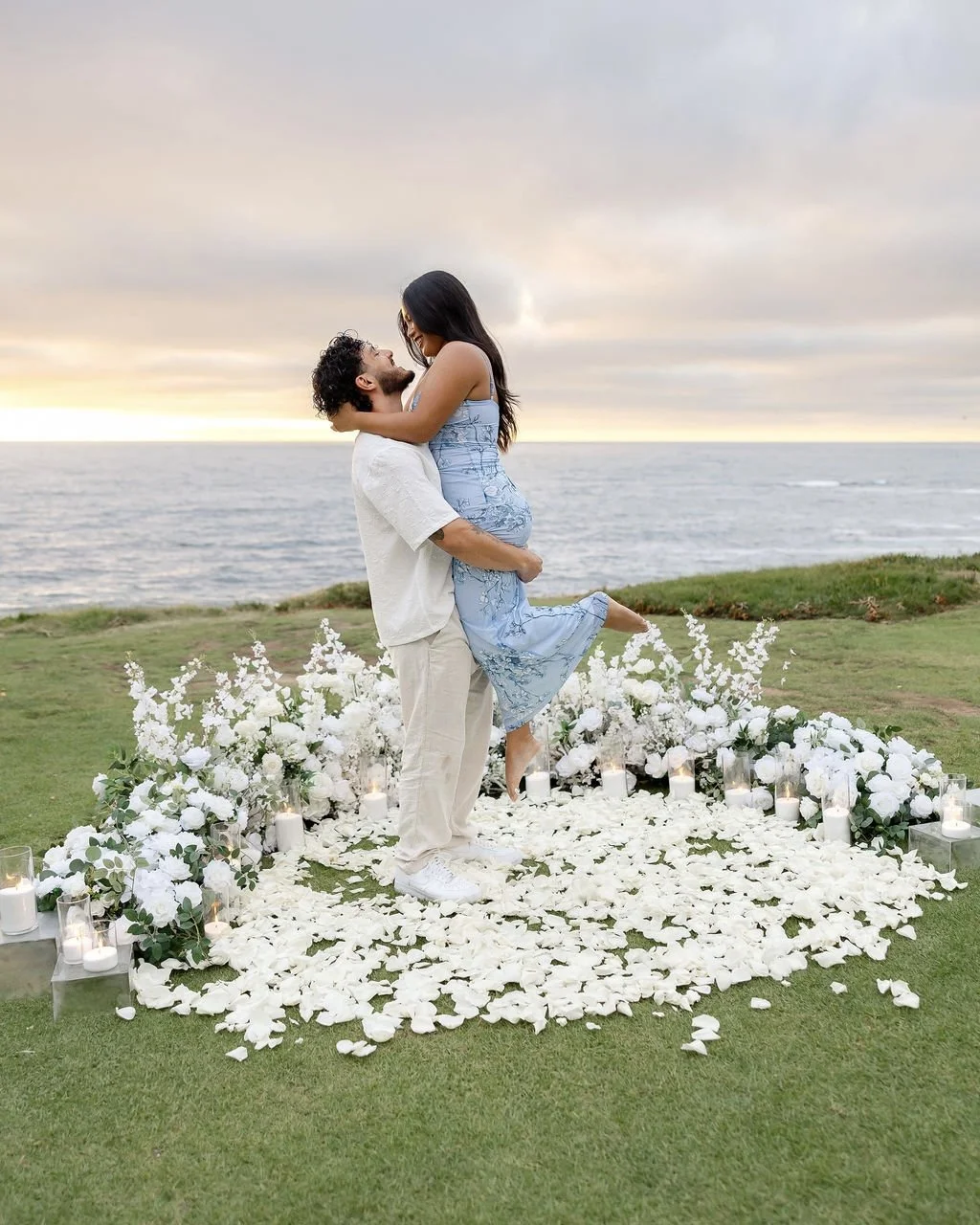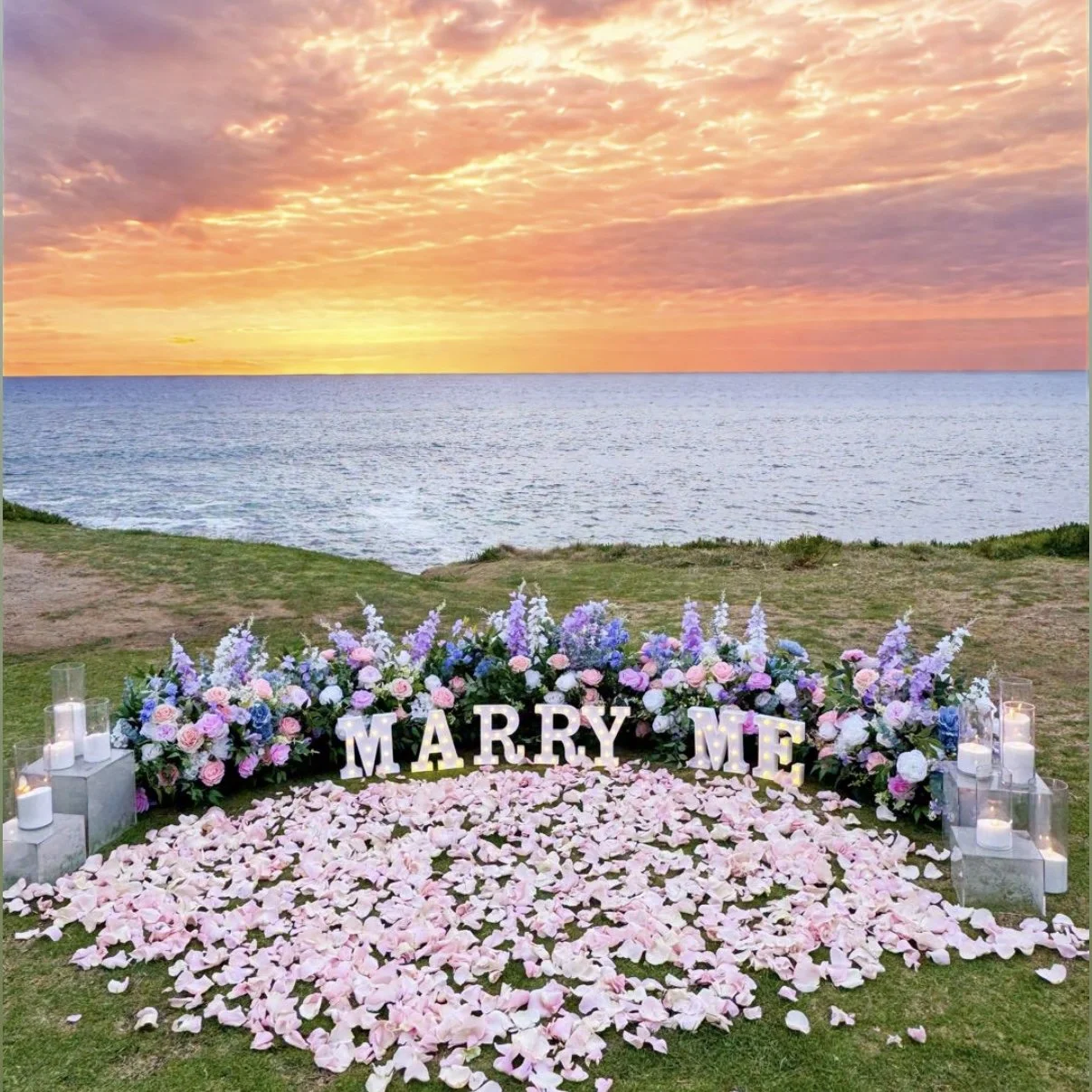 6 floor flower arrangements, lots of fresh rose petals, real candles, Marry Me marquee letters (9in), sparkling cider and glasses. Bluetooth speaker to play your song.